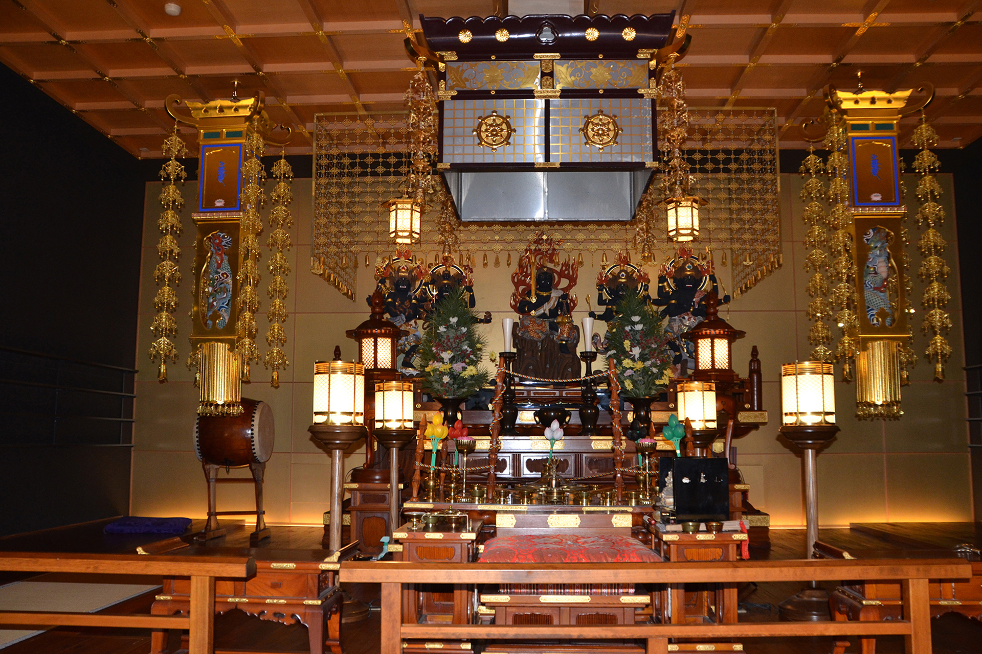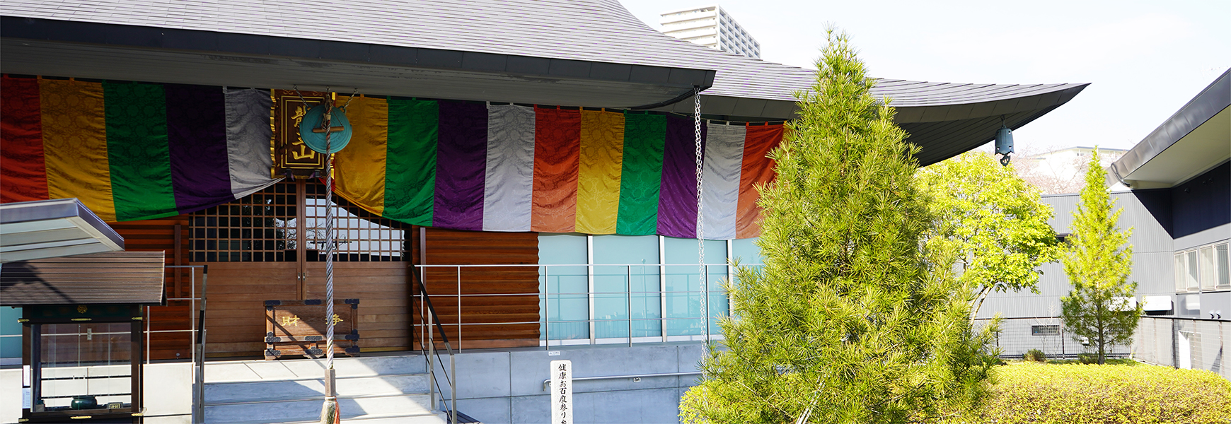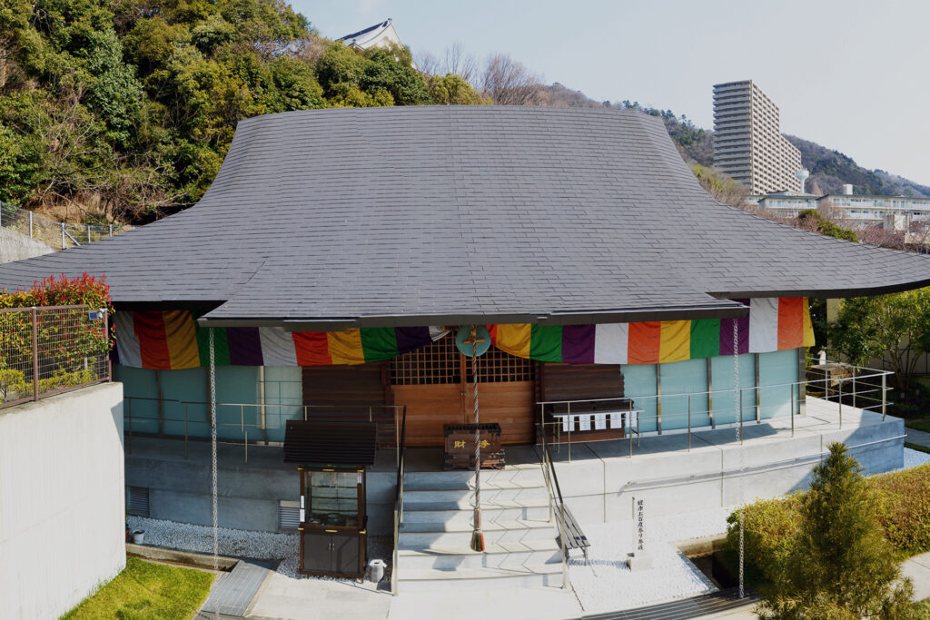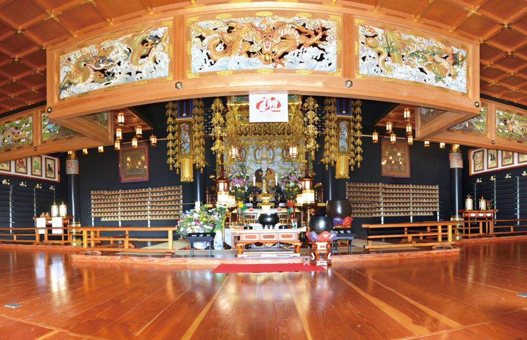 本 堂 側壁は総ガラス張りで空中に浮かぶお浄土をイメージされており、優美な大屋根と相まって全国でも類をみない美しく、近代的かつ重厚な姿となっています。御堂内には大変歴史のある金剛界・胎蔵界の曼荼羅が祀られており、また永代供養のための法燈が灯され、檀信徒の願いを叶えてくれる身代り千躰大師が奉納されています。 護 摩 堂 本堂内より石畳の階段を下りると目にも眩しい 光床ひかりゆか が現れます。地下にある護摩堂は大変珍しく幻想的です。ご本尊は五大明王で中央に鎮座する不動明王、東方が降三世明王、南方が軍荼利明王、西方が大威徳明王、北方が金剛夜叉明王。いずれも憤怒の形相で圧倒的な存在感がお参りする方々を必ず助け上げて幸福にするぞと迎えてくださいます。一月の初護摩、二月の節分会(星供)に護摩炊きを行います。 龍 神 当山の北東には龍神様が祀られています。お寺の建設にあたり、当地の神様をお祀りすることと鬼門を封じるため、この場所に祀られています。 健康お百度参り お百度参りは、願いを叶えてもらおうとする仏様や神様に、百回お参りして祈願することです。お百度は修行の一つで、精神を集中させ雑念を持たず、一心に祈りながら参ることで仏様からのご加護が得られます。また、足は第二の心臓と呼ばれており、足裏も全身に刺激を与えて健康を維持しているといわれています。当山の健康お百度参りは白石を敷きつめてありますので、ぜひお試しください。 会 館 ご参拝の休憩所として会館を開放しています。 駐 車 場 地下に21台駐車可能です。バリアフリーで、本堂、護摩堂、境内墓地へはエレベーターとスロープでお参りいただけます。きれいに清掃されたトイレもバリアフリーでご利用いただけます。